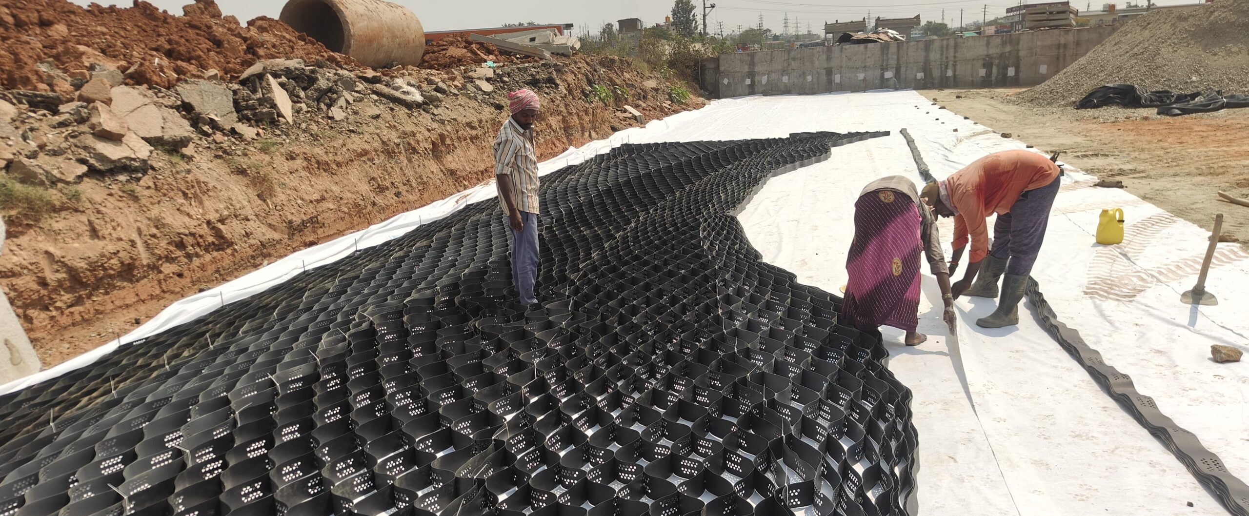 Geocells: 3D honeycomb structures that confine soil, ideal for steep slopes and heavy-load platforms.